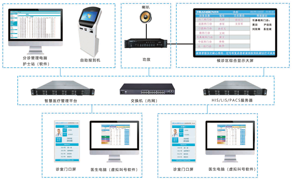 智慧醫(yī)療排隊叫號系統(tǒng),包括門診排隊叫號系統(tǒng)、藥房排隊叫號系統(tǒng)、醫(yī)技排隊叫號系統(tǒng)、體檢中心排隊叫號系統(tǒng)、預(yù)防接種中心排隊叫號系統(tǒng)等產(chǎn)品,在結(jié)合醫(yī)院現(xiàn)狀的情況下,結(jié)合醫(yī)院實際需求定制開發(fā)的一整套醫(yī)院排隊解決方案,主要用途是幫助醫(yī)院提高服務(wù)效率,減少患者排隊等候時間,在與HIS/PACS/LIS等醫(yī)院管理系統(tǒng)對接的情況下,做到精準的患者分流。